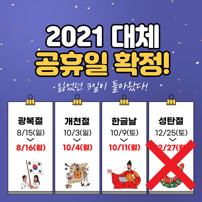 2021년 대체공휴일 - 슬기로운 탐구생활 from blog.kakaocdn.net 대체 공휴일의 기준부터, 가장 긴 연휴의 해는 언제인지! 대체공휴일 도입으로 경기 활성화에 도움이 될 것이란 주장엔 70% 가까이 동의했고, 생산성이 저하되고 기업의 부담이 늘 것이란 우려엔 찬반이 엇갈렸습니다. Not much of a three day holiday. 또 설날과 추석 연휴의 대체공휴일 시행도 명시했다. 그러면서 정부에 대체공휴일 확대 최소화와 대책을 마련해달라고 요청했습니다. 설날은 남북 모두 3일간의 공휴일로 지정하고 있다. 대체공휴일 전면확대법, 與 단독으로 행안위 법안소위 통과. 공휴일(대체공휴일 포함)을 유급휴일로 부여해야 하지만, 불가피하게 근무할 수 밖에 없는 경우에는 공휴일에 근무하는 대신 다른 근로일을 정해 유급휴일로 부여하는 이른바 '휴일대체'를 할 수 있습니다.